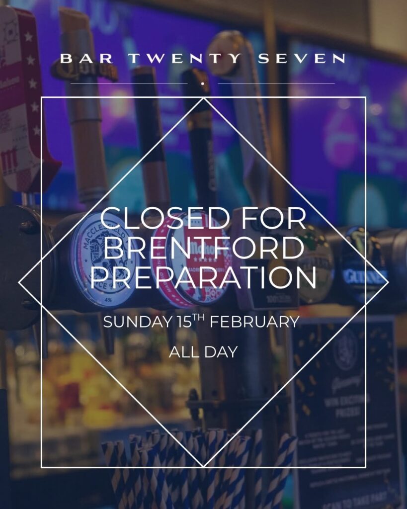 Bar Twenty Seven will close temporarily on Sunday 15th February to allow for broadcast preparations ahead of our Emirates FA Cup Fourth Round tie against Brentford on Monday evening.