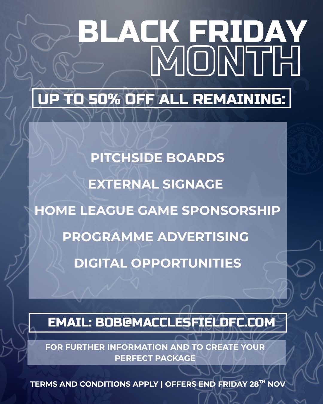 Email bob@macclesfieldfc.com for further information, but be quick as this limited time offer ends TOMORROW (Friday 28th Nov) at 5pm.